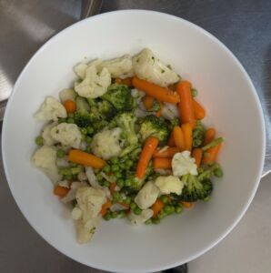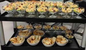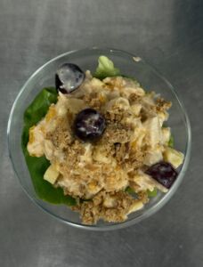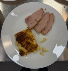 kipcocktail, beenham, aardappelgratin, gemengde groenten, appelmoes, stoofpeertjes, grand dessert.