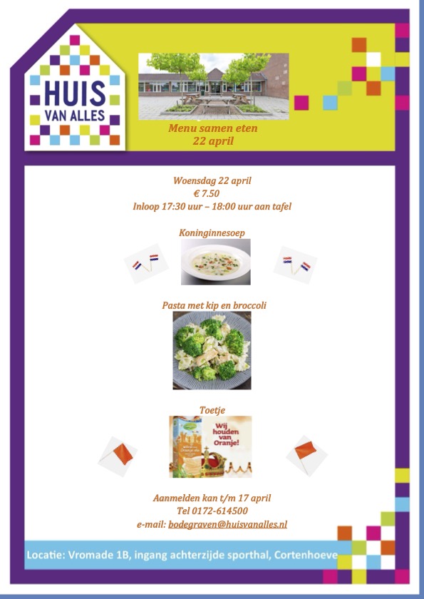 Koningssoep. Tomaat komkommer salade. Pasta met kip en groenten. Oranje toetje met slagroom. Bestek afdrogen. Administratie bijhouden. Druk bezig