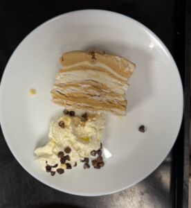 Kippensoep. zuurkoolschotel. ijs met slagroom en chocolade.